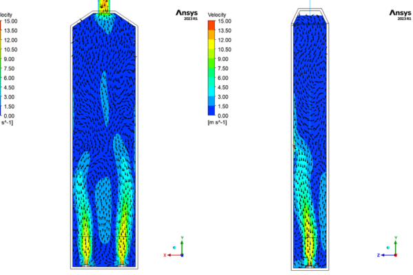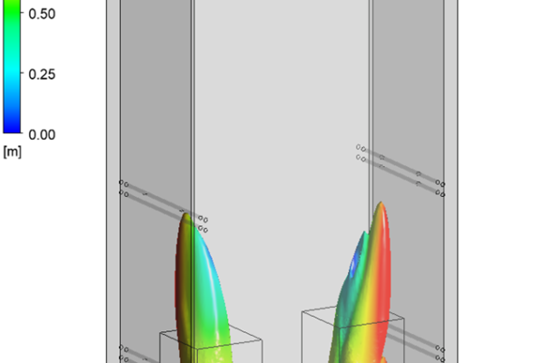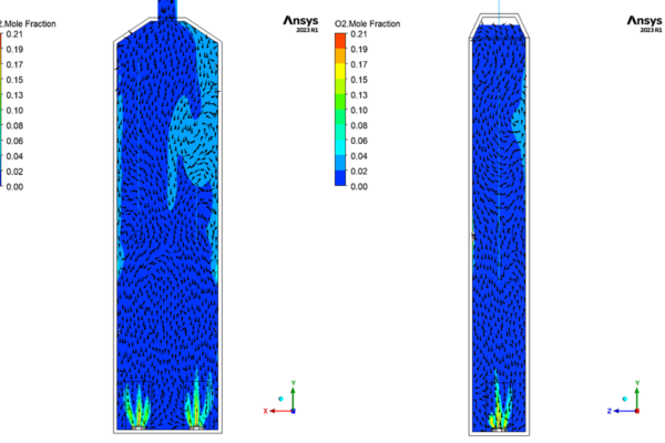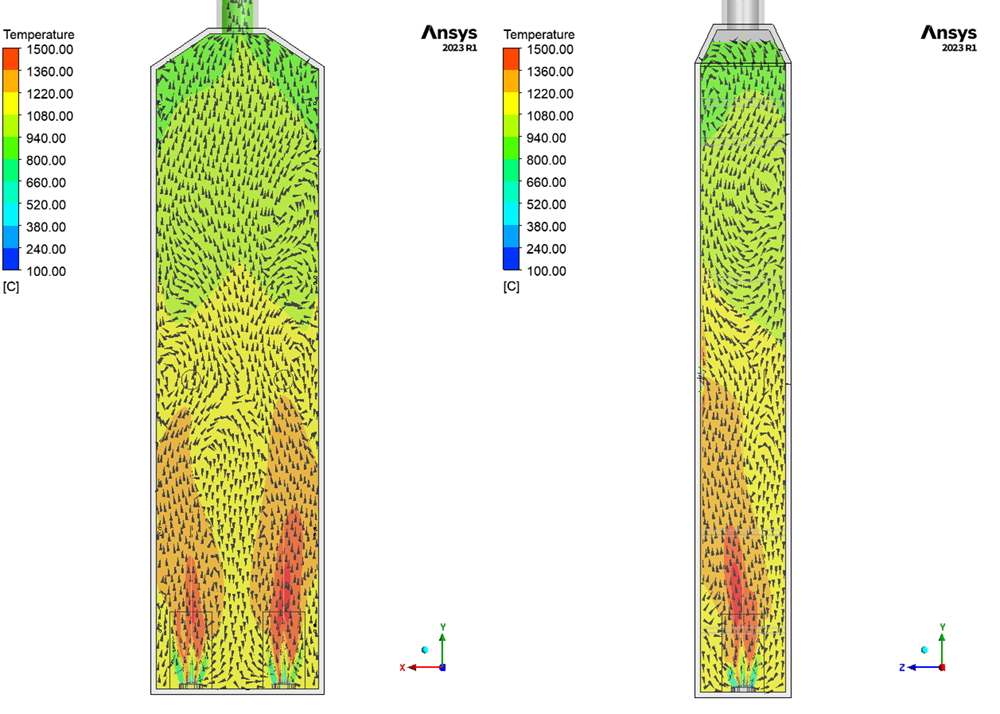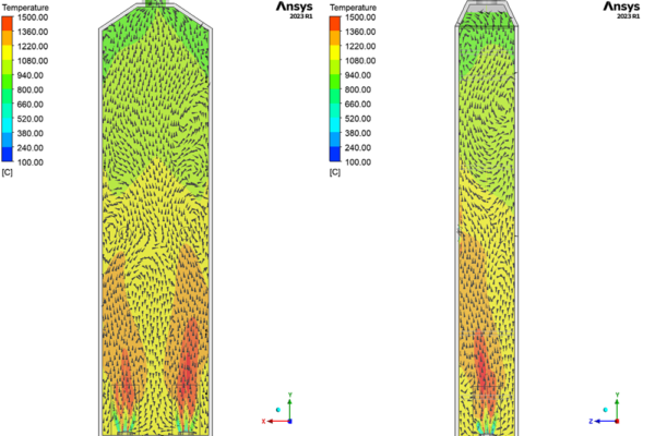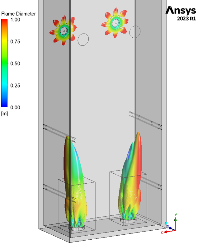We have run a simulation on one of our ten furnaces at ICE testing facility with 4 burners in parallel (2 bottom floor and 2 radiant type) to evaluate as output path of velocity, pressure and temperature path as well as the interaction between burner and flame dimensions.