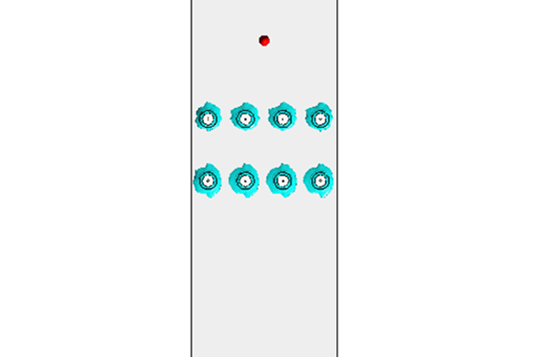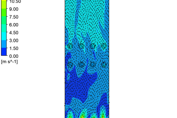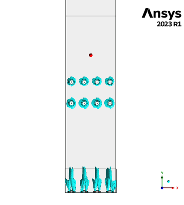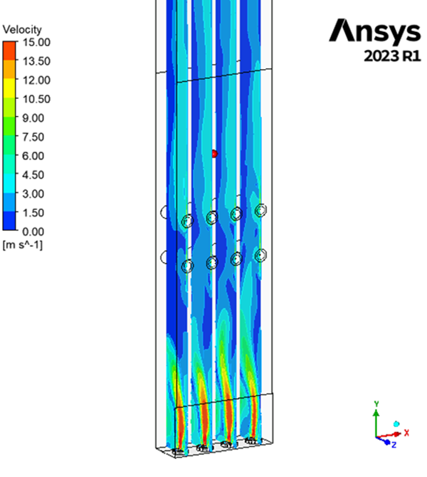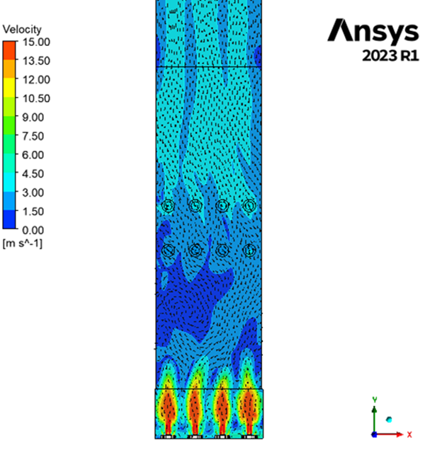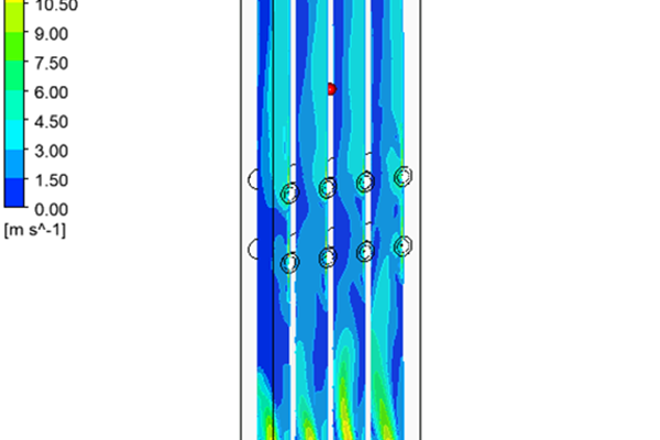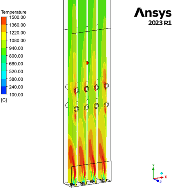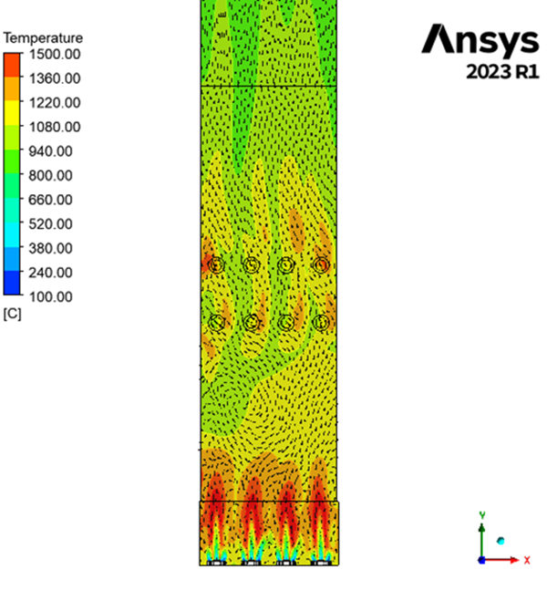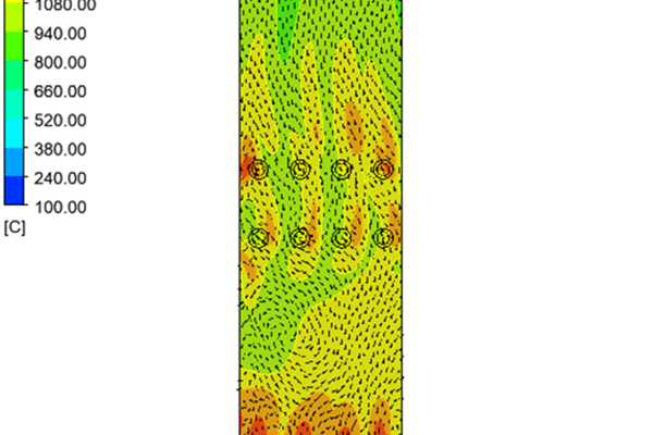 We have run a simulation on a field application furnace with 12 burners (4 bottom floor and 8 radiant type) to determine output velocity, pressure drop, heat flux and temperature path as well as interaction among flames.